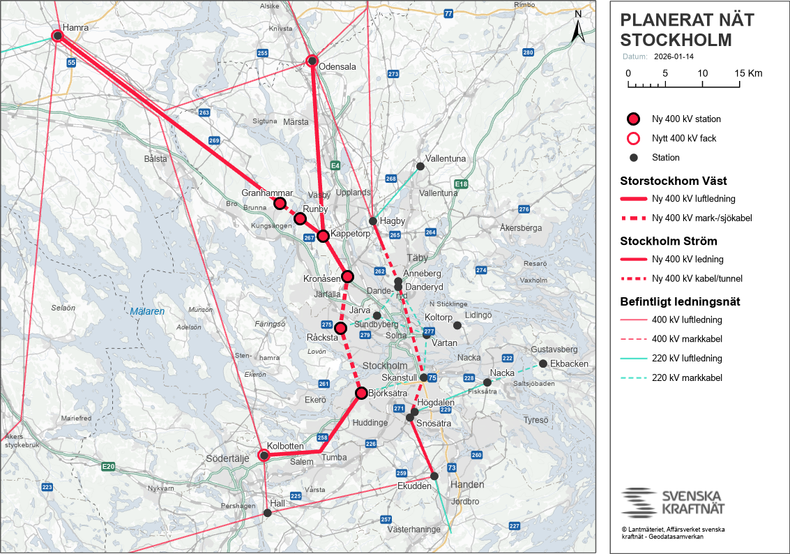 Transmissionsnätet förstärks mellan Hamra och Överby - För att trygga elförsörjningen idag och imorgon för ett lysande Stockholm planerar vi en 5 mil kraftledning för 400 kV mellan stationerna Hamra och Överby. Den ersätter en befintlig 220 kV-ledning.