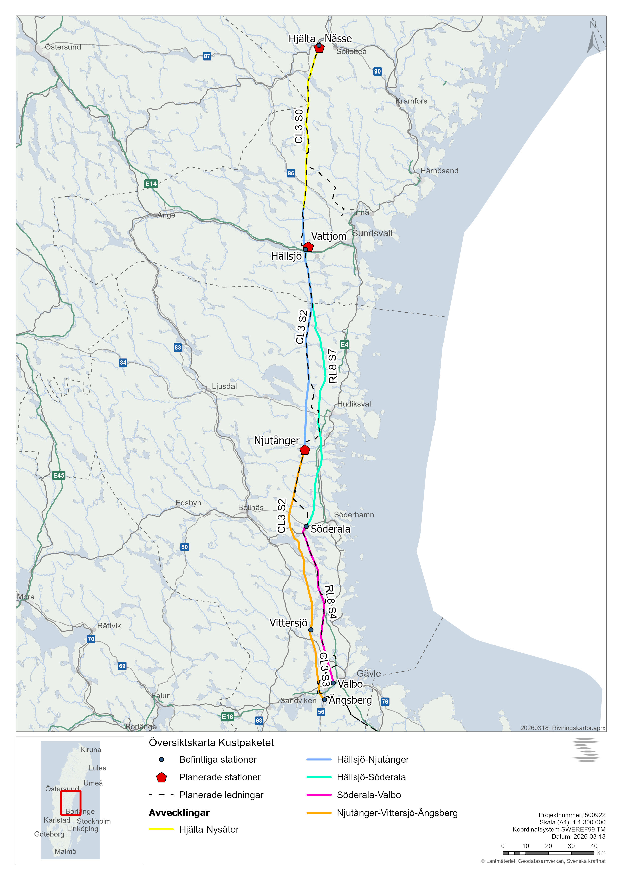Kustpaketet omfattar totalt cirka 350 km ledningar mellan Nässe och Mehedeby samt en separat cirka 125 km lång sträcka mellan Hällsjö och Söderala.